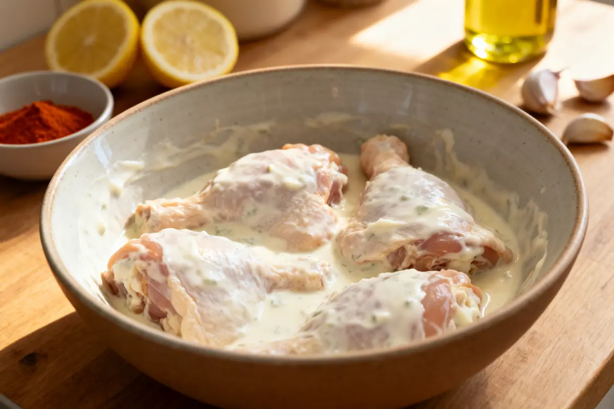 Quando il pollo rimane asciutto o poco saporito, quasi sempre il problema è la preparazione. La marinatura lavora in silenzio. Ammorbidisce le fibre, aggiunge aroma e mantiene la carne umida anche durante la cottura. È un passaggio semplice ma molto efficace, soprattutto per le cosce che hanno già una buona quantità di grasso naturale.